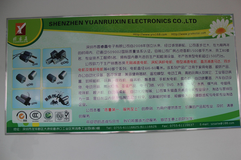深圳市圓睿鑫電子有限公司自2008年創(chuàng)立以來,經(jīng)過誠信耕耘,在為期兩年的時(shí)間內(nèi),已通過ISO9001:2000國際質(zhì)量體系認(rèn)證。公司廠房占地面積2000多平方米,員工100人,專業(yè)技術(shù)工程師6名,擁有國內(nèi)最先進(jìn)的生產(chǎn)和檢測設(shè)備,年產(chǎn)各類減速電機(jī)超過2~300萬臺(tái)。因公司發(fā)展需要,于2020年底,將生產(chǎn)基地遷往擁有最美小鎮(zhèn)之稱的東莞市清溪鎮(zhèn),依山傍水,依托美麗的大自然環(huán)境和地方文化,全新的東莞市圓睿鑫電子有限公司將借助深圳母公司平臺(tái),一步步走上新的臺(tái)階。